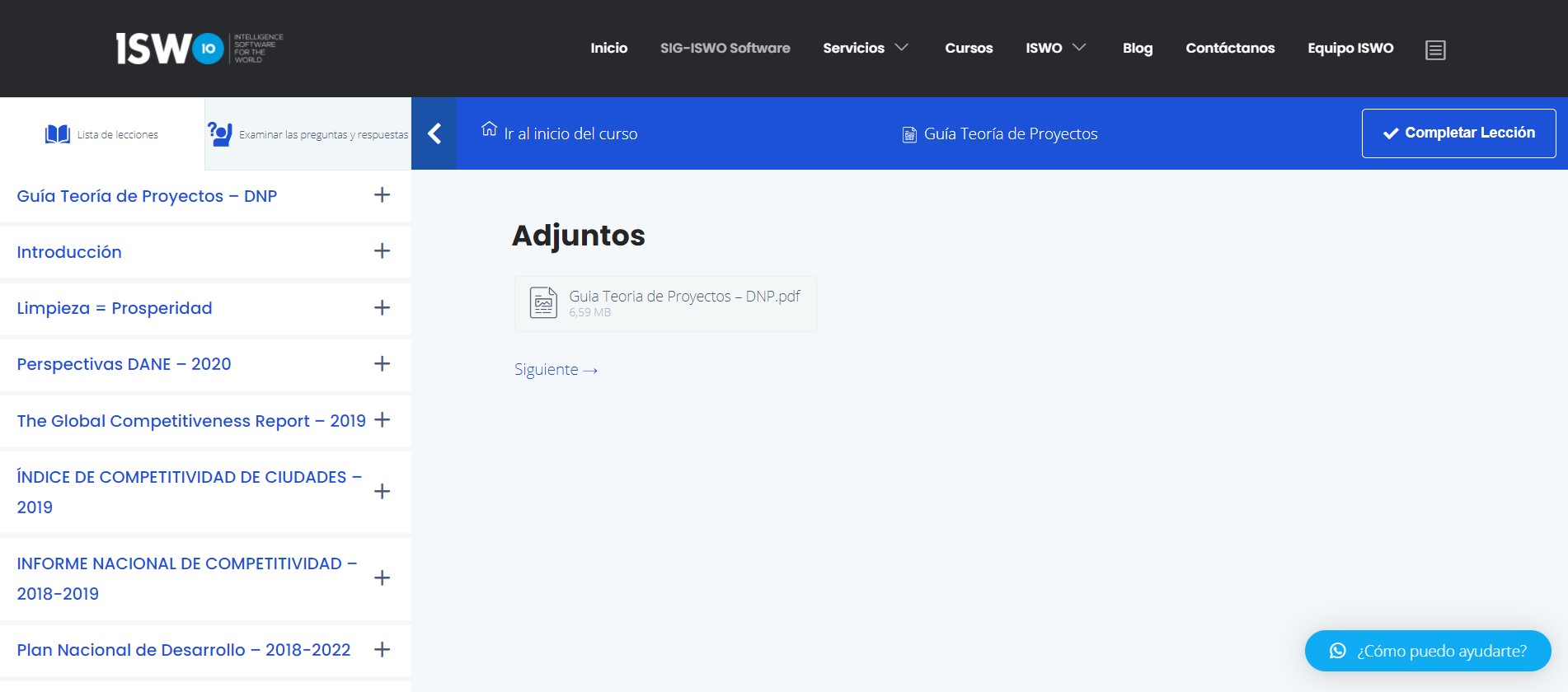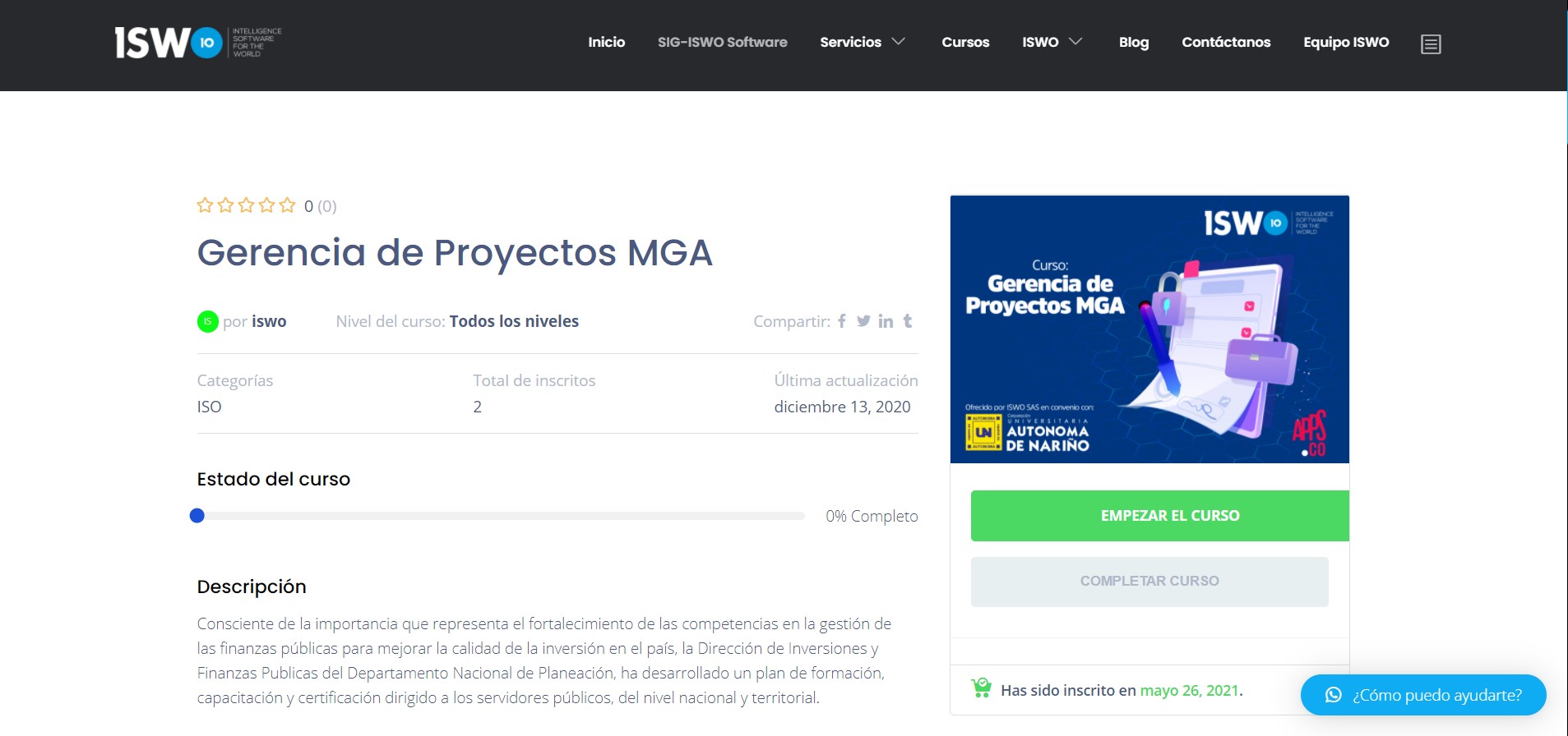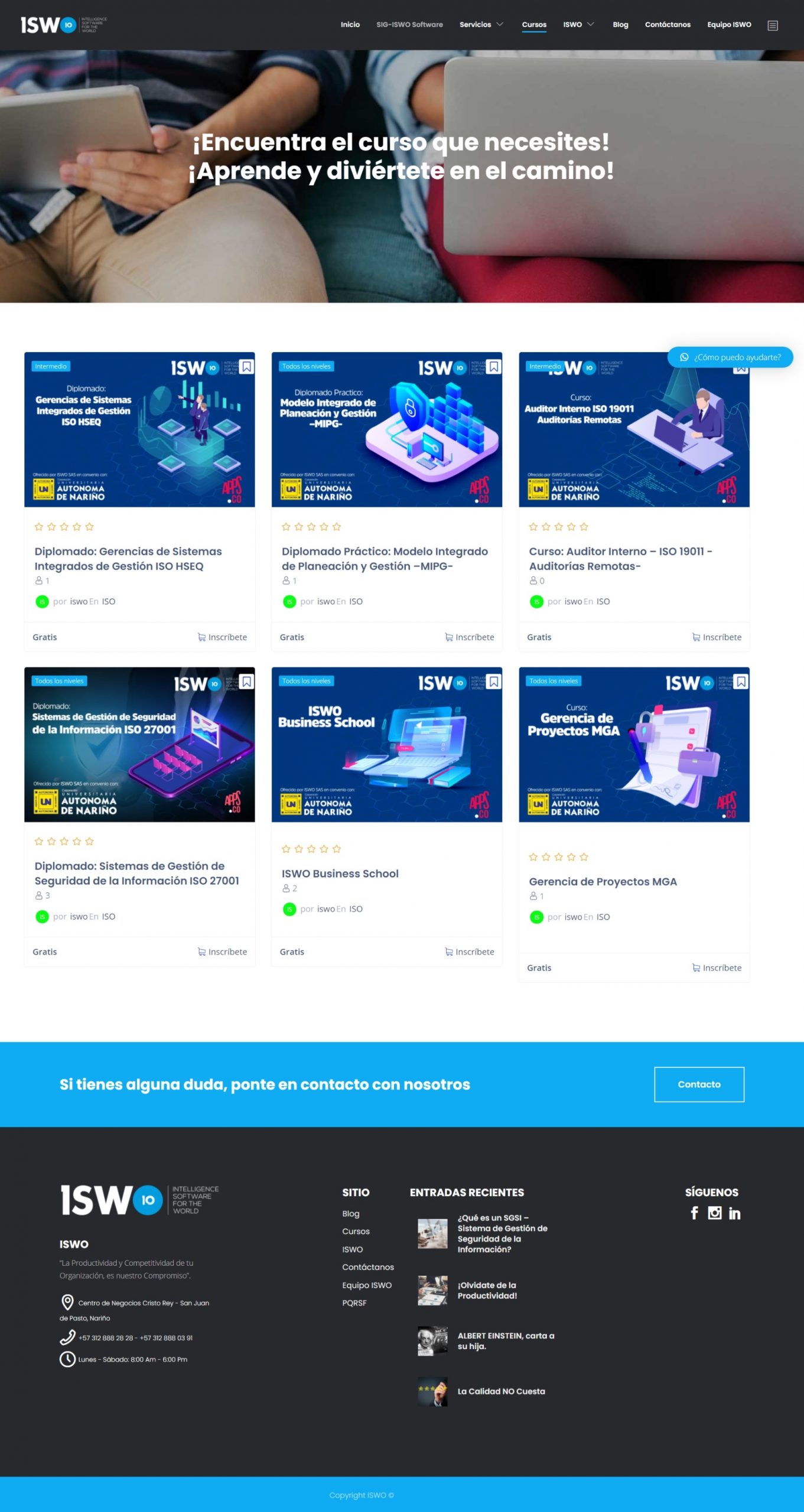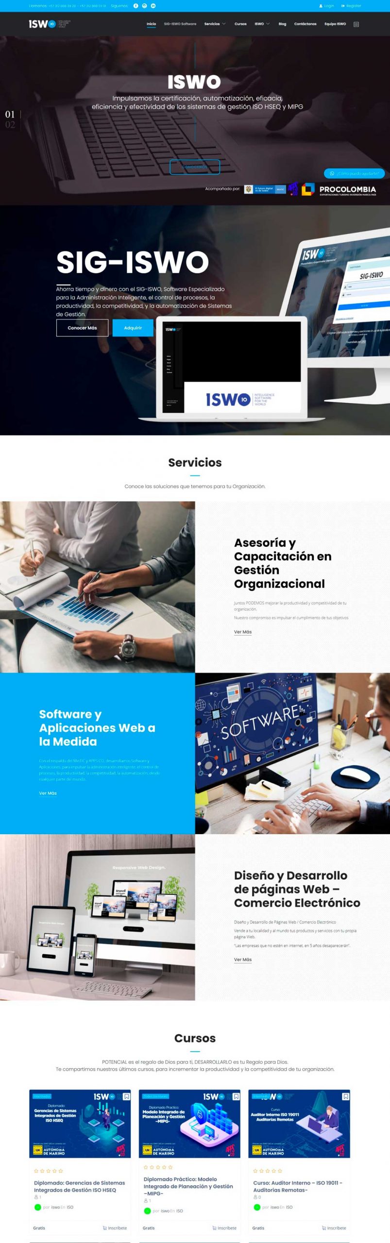 Desarrollo de página web corporativa para Iswo y su software Sig-Iswo, esta página web tiene integración con una plataforma de cursos.